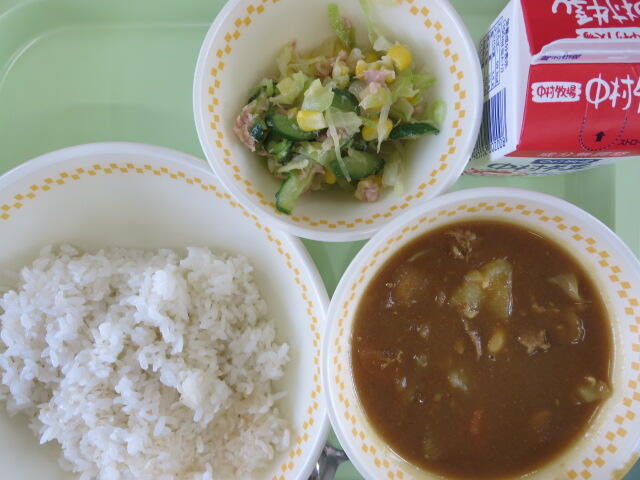 【カレーライス ドレッシングサラダ おいわいクレープ 牛乳】