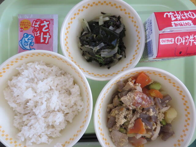 今日はカミカミデーでした。おいしさぎゅっと丼は、西臼杵産の牛肉と干ししいたけ、千切り大根などが入った牛丼です。小さいおかずは茎わかめを使っているので、噛みごたえがあったと思います。とても贅沢な献立でしたね。