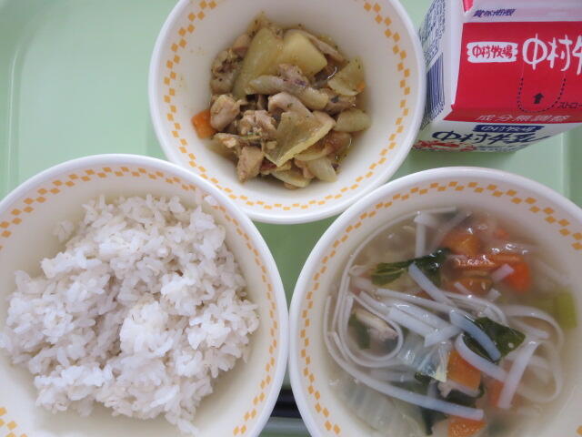 今日はさつまいもがゴロゴロ入ったシチューでした。(写真では沈んでいて見えませんが…)さつまいもの甘味がありおいしく食べられたと思います。サラダのドレッシングは、道の駅にも売っている日之影町のゆず果汁と油、塩、しょうゆ、砂糖を混ぜ合わせて作っています。パンにはジャムもついて、子どもたちは給食を取りに来る時からウキウキでした