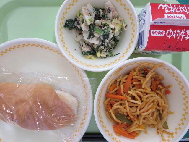 【米粉パン スパゲッティナポリタン シャキシャキごまサラダ 牛乳】