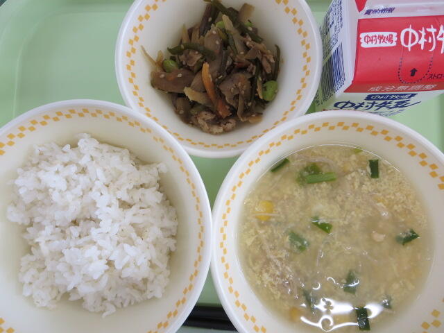 【麦ご飯 きんぴらごぼう かき玉スープ 牛乳】