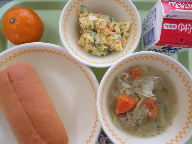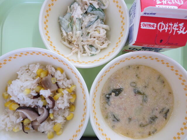 【きのコーンごはん 韓国風ご汁 切りぼし大根のオーロラソース 牛乳】