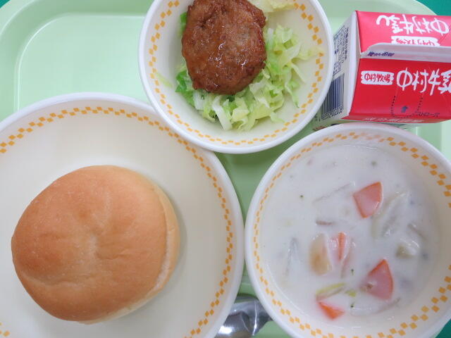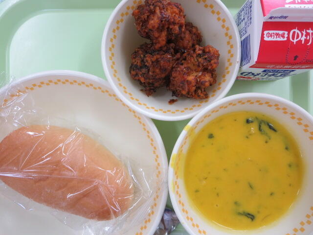 【コッペパン パンプキンポタージュ 揚げたこ焼き 牛乳】