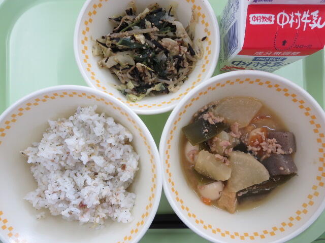 【うめちりごはん スタミナみそおでん ひじきのごまじょうゆ炒め 牛乳】