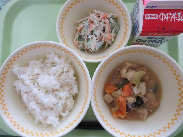 【麦ご飯 五目豆 切りぼし大根サラダ 牛乳】