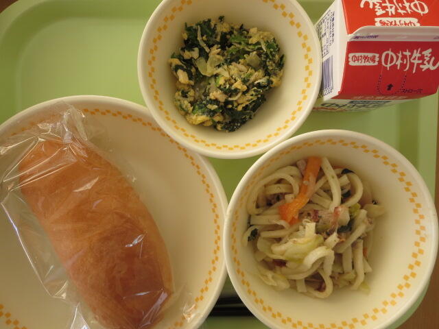 【米粉パン 焼きうどん こまつなの卵とじ 牛乳】