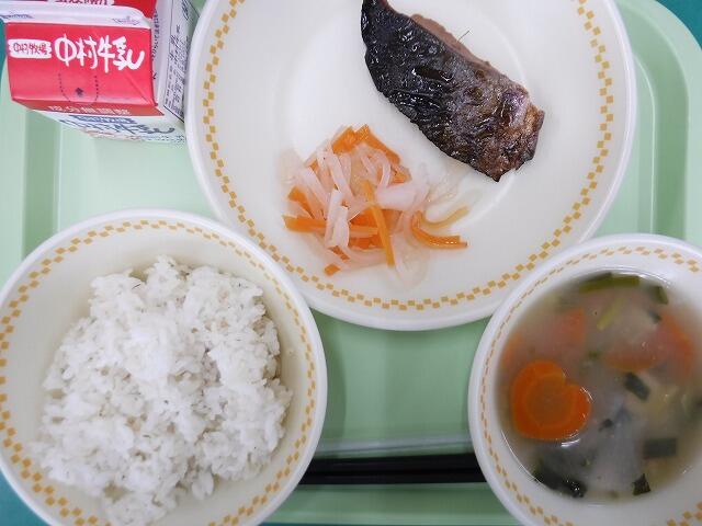 【麦ご飯 しいたけとさつまいもの南蛮づけ ぶた汁 牛乳】
