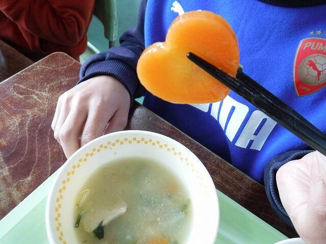 今日の給食は、お正月メニューでした。ハッピー雑煮には、調理員さんがそれぞれの食缶に分けて入れてくれたハートや星の形のにんじんが入っていました。全員分とはいきませんでしたが、入っていた人はラッキーでしたね♪