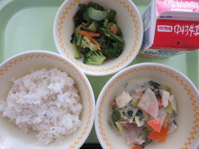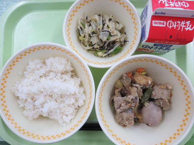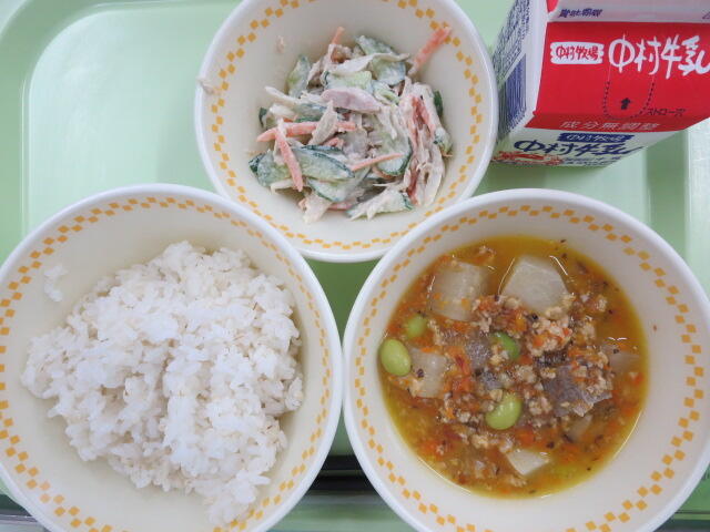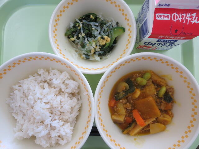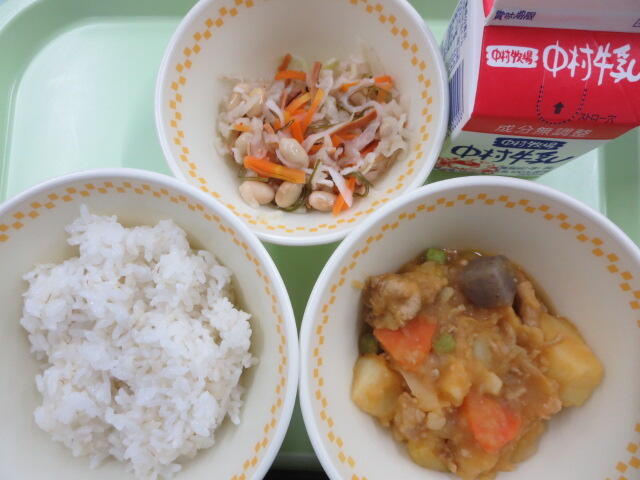 カレーライスとフルーツポンチという定番の人気メニューで月曜日がスタートしました。寒くなってきて登校が億劫になる時期ですが、給食が少しでも学校に来る楽しみになるといいなと思います。