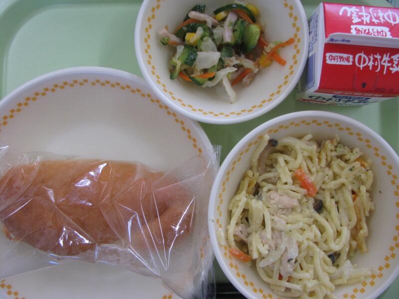 【米粉パン きのこのクリームスパゲッティ りっちゃんサラダ 牛乳】