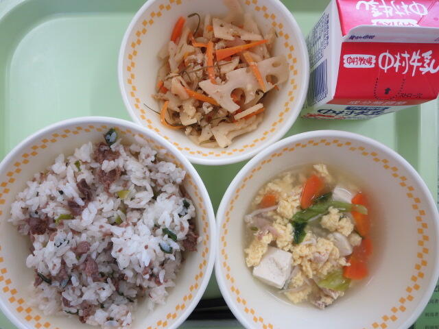 今日の放送「一口メモ」は今日は地産地消給食の日です。ギュッとまぜ栗ごはんに使われている牛肉、くり、しいたけは、日之影町産です。日之影町の食材をぎゅっと詰め込んだごはんなので、このような名前をつけました。日之影町はもちろん宮崎県内、日本国内には食べ物をを大切に守り育てている人たちがたくさんいます。食べ物の命、私たちが食べるまでにかかわった多くの人たちに感謝しながらおいしくいただきましょう。そして、ふるさとの食べものや料理、食べるということをこれからも大切にしていきましょう。