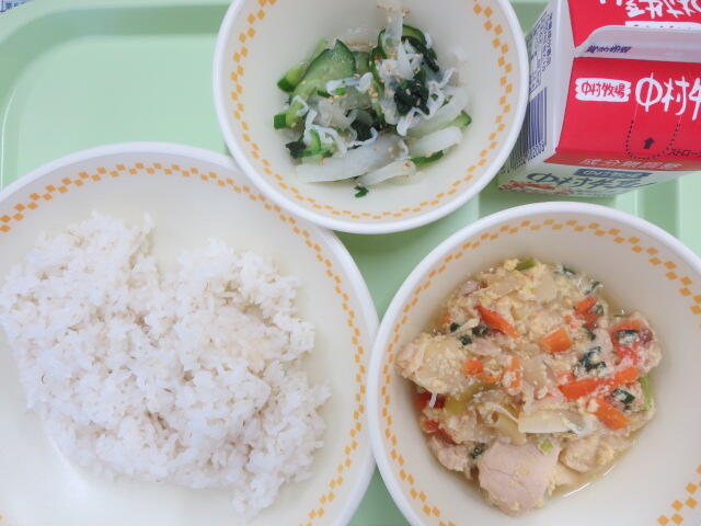 【肉ごはん かき玉スープ ちゃつ 牛乳】