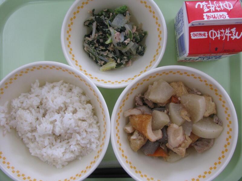 大根の種類は、大きさ1個わずか20gの二十日大根から1本30㎏になる桜島大根まで、いろいろな種類があります。形は聖護院大根のような丸いものや守口大根のようにごぼうのように細長いものもあります。一番多く作られているのは、辛さが少なく、みずみずしいのが特徴の青首大根です。今日の大根も青首大根です。大根の白い部分には、体の調子を整える働きのあるビタミンCが含まれています。葉には、ビタミンCだけでなく、カロテンやカルシウム、鉄などの栄養素がたっぷり含まれています。これからが大根がおいしくなる時期です。給食でもたくさん使っていきますので食べてくださいね。