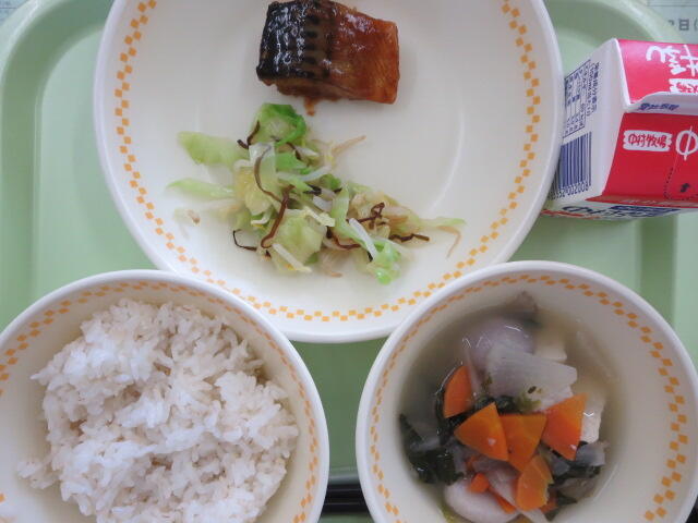 【麦ご飯 さばのみぞれ煮 塩こんぶあえ けんちん汁 牛乳】