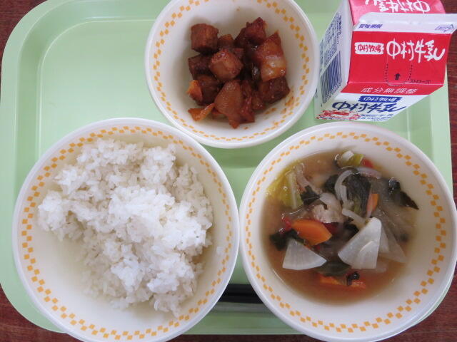 【カミカミごはん 牛乳 にんじんしりしり 豆乳春雨スープ】