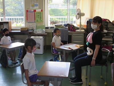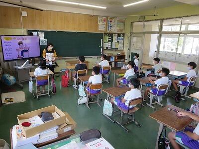 悪い姿勢をしていると、背骨が曲がったり、内臓が圧迫されて血液の流れが悪くなったり、集中力がなくなったりと悪影響がたくさんあります。そこで、立腰の効果について説明した後、一緒に立腰の練習を行いました。字を書く時や給食を食べるときも、守ってほしいと思います!