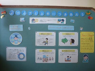 11月13日(土)~19日(金)は、アウトメディア週間です。みなさん、メディアコントロールはできていますか?メディア機器を完全に取り除くことは不可能なので、上手につきあっていくことが大切です。そこで、メディアと上手に付き合っていくためのポイントを2階の踊り場に掲示しています。この機会に自分のメディアの付き合い方を見直してみましょう