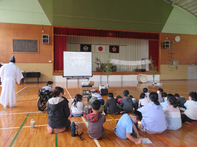 今日は、子どもたちに地域の神楽に親しんでもらおうと「大人(おおひと)神楽保存会」の方が来校されました。