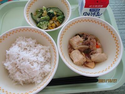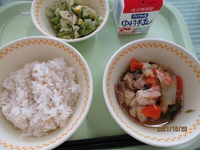 今日は、白みそで鶏肉、こんにゃく、じゃがいも、だいこん、れんこんを煮込んでいます。みそ味なので、ごはんがすすみました。
