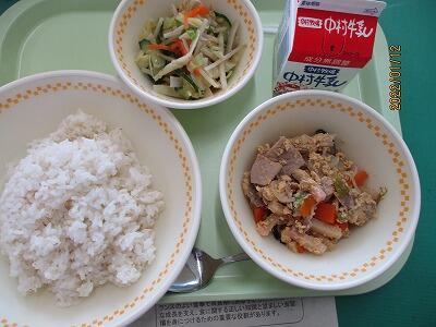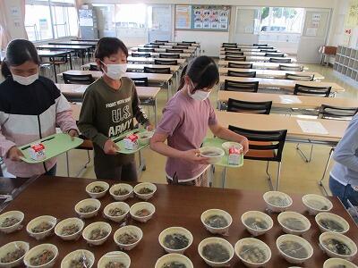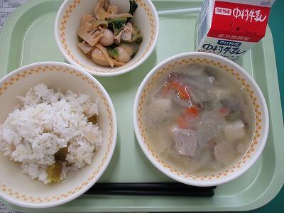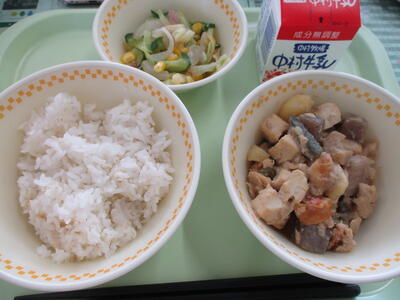 今日は、日之影町産のむき栗を高千穂牛と一緒に混ぜたぎゅっとまぜ栗ごはんでした。給食では、量が多くなるため、皮むきが大変な栗を取り入れるのは、難しかったのですが、生産者の方が大変な栗の皮むきを引き受けてくださり、給食に取り入れることができています。
