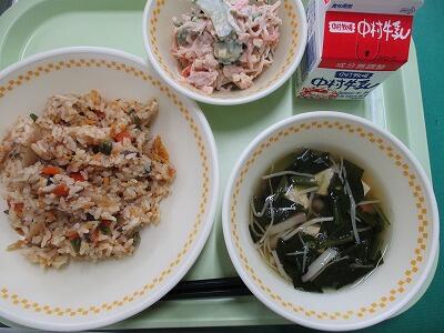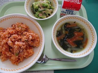 今日は、鶏肉とたまねぎやにんじん、グリンピースをたっぷりのケチャップで味をつけた具をごはんに混ぜたチキンライスです。