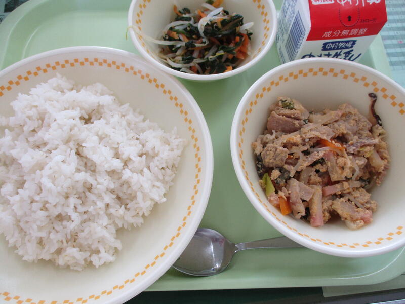 1学期はじめの給食は、豚肉と卵を使った他人丼です。