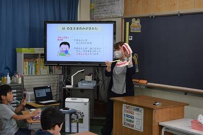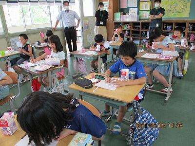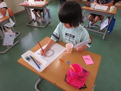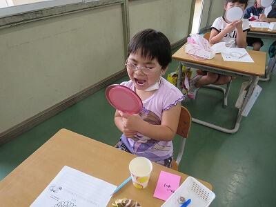 1年生に、「歯の王様を守ろう」の授業をしました。歯の王様とは、6才臼歯のことです。自分に6才臼歯が生えてきているかを確認し、上手に磨く練習をしました。また、むし歯予防の効果もある「あいうべ体操」も一緒にしました。最後には、歯の王様に「歯ブラシをよこから入れるよ」「こちょこちょ磨きをがんばるよ」などとお手紙を書いてくれました