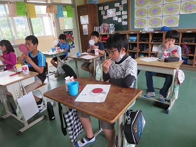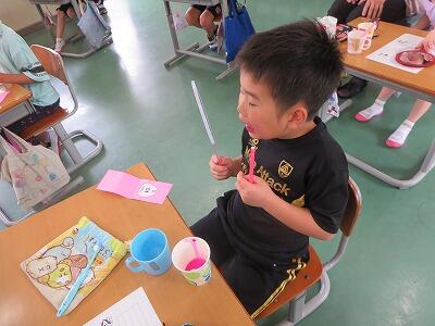5年生で歯周病についての授業を行いました。永久歯がなくなる原因の第1位が歯周病だと知り驚いていました。染め出しで磨き残しがあるところを確認し、歯みがきで上手に色を落とすことができていました