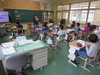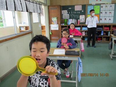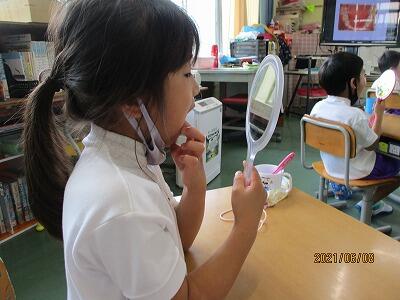 3年生に歯の授業をしました。歯の生え変わりが盛んな時期なので、でこぼこ歯並びで磨きにくい人も多いです。染め出しを行い、磨きの残しがある部分を調べました。奥歯や前歯の磨き残しが多いように感じました。歯ブラシの部位や角度を変えて磨く練習をすると、最後にはきれいに色を落とせていました