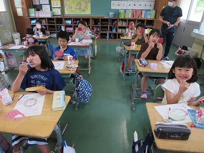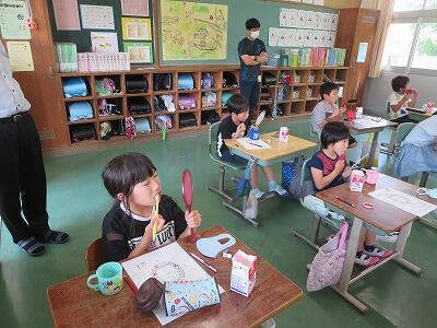 また、よく食べるおやつにどのくらい砂糖が入っているのかをチェックすると、「こんなに⁉」と驚いていました。おやつの砂糖の量が書いてあるプリントを配付したので、おうちでも家族と一緒に見てほしいです