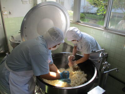 給食の混ぜご飯は、炊飯器に具材を入れて炊くのではなく、炊いたご飯に味付けをした具材を混ぜて作っています。そのため、混ぜる作業がとても重くて大変です。