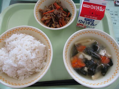 給食では、豆料理がたくさん登場します。豆は、植物の種です。この種を土に植えて、水をかけると植物が育ちます。つまり、豆には、生 きる力がたくさんつまっています。みなさんに大きく元気になってもらいたいという願いをこめて、給食にいろいろな豆料理を出しています。今日は、大豆を使って鶏肉と大豆の煮物を作りました。