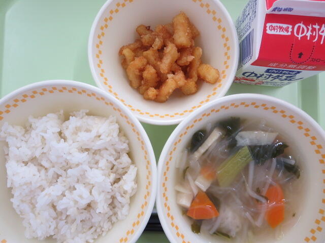 【麦ご飯 いかのさらさ揚げ ごぼうだんごスープ 牛乳】