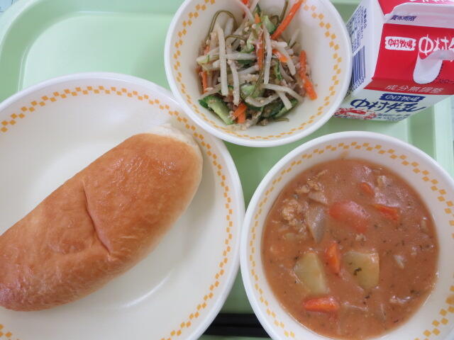 【米粉パン とり肉のミルクトマト煮 さっぱりごぼうサラダ 牛乳】