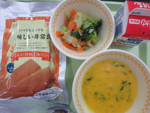 今日のパンは、各学校に備蓄していた非常食です。地震や大雨などの災害時には、電気やガスが使えなくなったり、道路が寸断され、食べ物が手に入らなくなったりすることもあります。そんなときは、お家にあるものや非常食を食べることになります。最近では非常食も進化していて、なんと、25年保存できる雑炊や、冷蔵庫に入れずに90日ももつ牛乳などがあるそうです。今日のパンは5年前に買っていただいたものです。非常時はごはんやパンなど、炭水化物に偏り、野菜や果物などのビタミン類が不足しやすいので、栄養バランスを考えたものを備蓄するといいですね。今日も食べ物に感謝する気持ちを忘れずにいただきましょう。