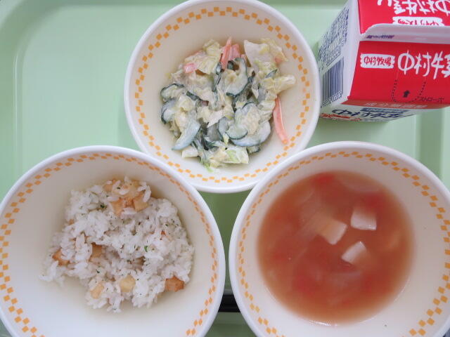 今日のごはんは「じゃがじゃがごはん」でした。じゃがいもを油で揚げて、塩とパセリをかけて混ぜ込みました。混ぜご飯にしたり、ふりかけで味をつけたりすると食が細い子や1年生でも食べやすいですね。