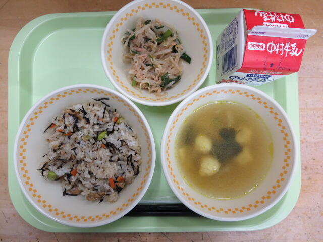 【ひじきごはん つくねカレースープ もやしのピリ辛いため 牛乳】