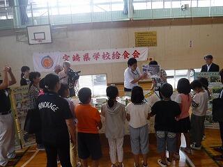 今日は、4時間目に地産地消交流給食会があり、宮水小4年生と町内5年生が宮崎県の食材について学習しました。県の学校給食会や県漁連、JA、(株)本吉の方々が体育館にそれぞれブースを設置して、漁業、農業、しいたけ、その他県産品(切りぼし大根、ほうれん草など)について話をしてくださいました。子どもたちが興味をもって、真剣に話を聞いている姿が印象的でした