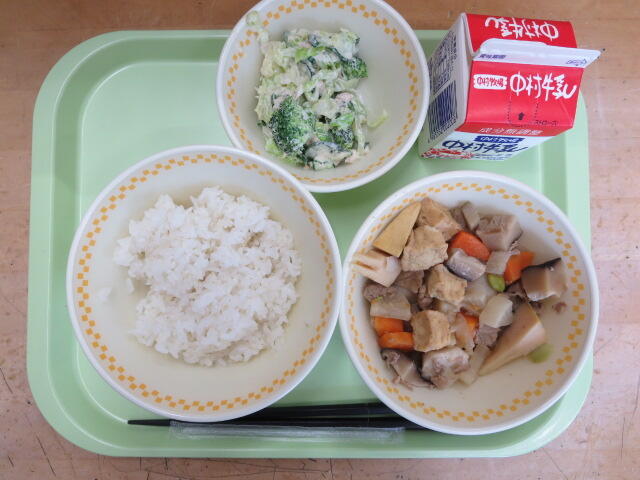 【麦ごはん うまに アーモンドサラダ 牛乳】
