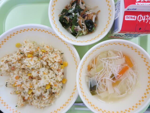 【しゃけチャーハン くらげの中華あえ ビーフンスープ 牛乳】
