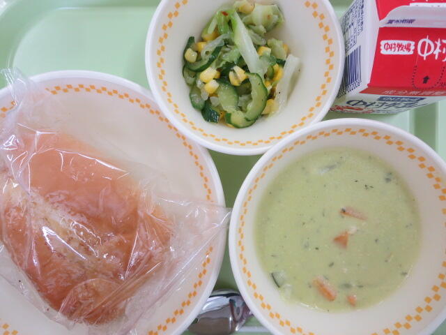 【マヨネーズパン グリーンシチュー ドレッシングサラダ 牛乳】