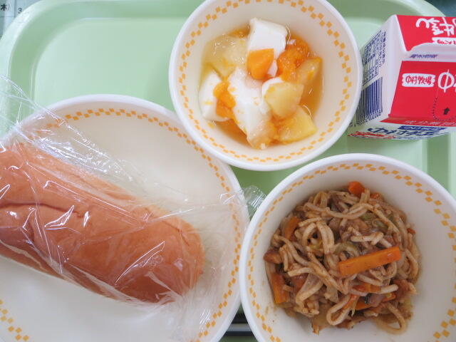 【ミルクパン 焼きそば フルーツ杏仁 牛乳】