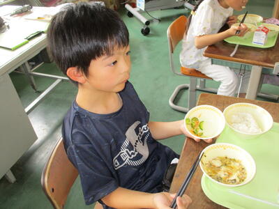 担任の先生と一緒にみんなそれぞれ指をおりながらかむ回数を数えたり、一口食べたらはしを置いたりして、かむことを意識して食べていました。よくかむことは体によいことがたくさんあります。大切にしてほしい習慣です。