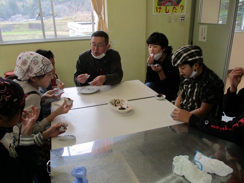 まず、自分たちが収穫したもち米を使ったスイーツづくりをしました。子どもたちの手つきを見ながら、アドバイスをしてくださったり、楽しい会話をしたりするうちに、いちご大福ができあがりました!