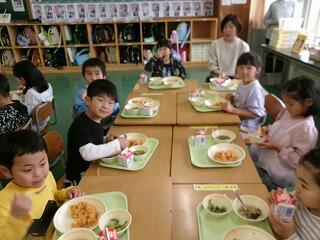 小学校初めての給食です。どのおかずも減らさず食べていました。