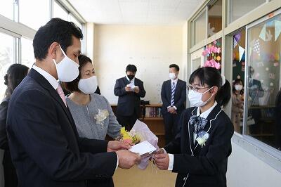教室に戻り、学級でのお別れをしました。先生から子ども達が一人一人メッセージをもらいました。そして、最後に、子ども達から保護者へ手紙と花束を贈りました。