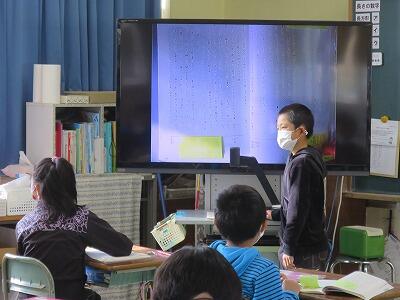 4年生では国語で教材文「プラタナスの木」の学習をしていました。教材文を読んで工夫してある表現を見つけ、その表現に込められた筆者の思いを付箋にまとめ、発表し合っていました。友達と考えと自分の考えを比べて、話し合うことができていました。