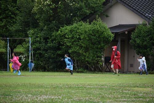 長靴、雨合羽、かさを用意し、準備はばっちりです。歩いているうちに雨がやんできましたが、水たまりに入ったり、木の下で葉っぱをゆらして雫が落ちてくるのを楽しんだりしました。アジサイやカタツムリなども見つけることができました。