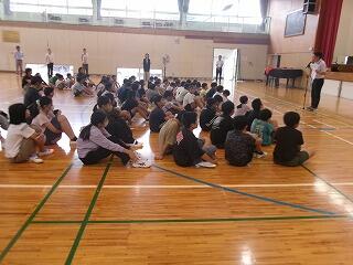 今月の目標について担当の先生から話がありました。目標について質問されて、全校児童の前で意見を述べることができた人もいます。