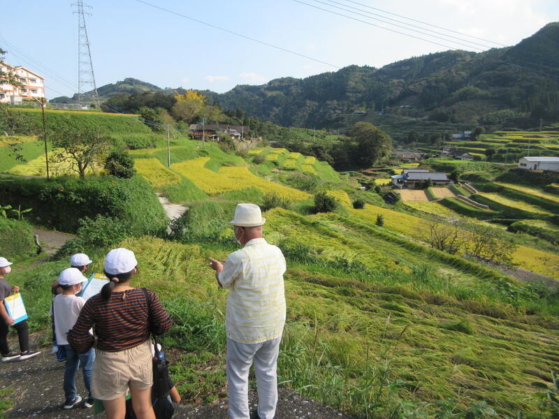 周囲を見渡すと、すり鉢状の地形にできた美しい棚田の風景が広がっていました。大人歌舞伎にまつわる人物や施設、さらにはこのような自然など、改めて日之影町のよさを学ぶことができた時間となりました。丹部様、ありがとうございました。次回は、もう一つのグループの活動をご紹介します。
